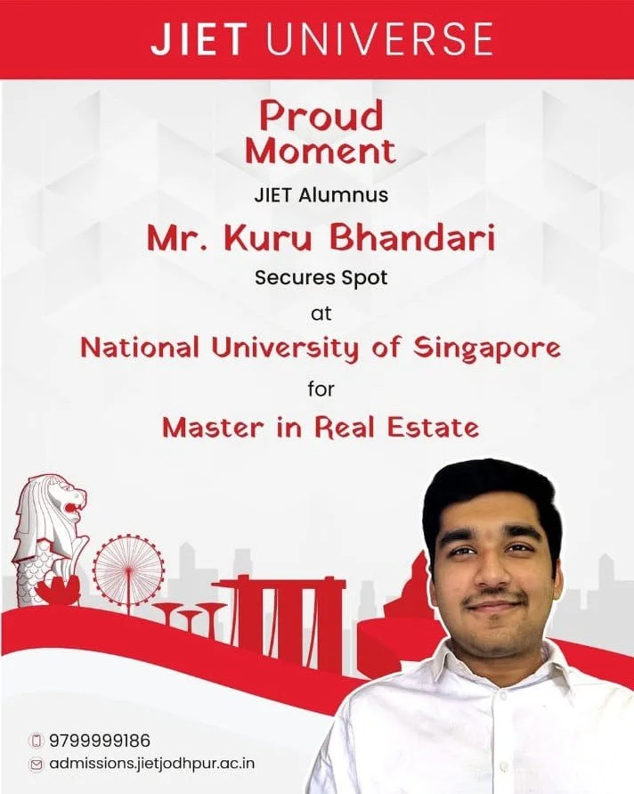A moment of pride for JIET Universe as our alumnus Mr. Kuru Bhandari secures a place at the prestigious National University of Singapore for a Master’s in Real Estate. His achievement reflects the academic excellence and global vision nurtured at JIET.